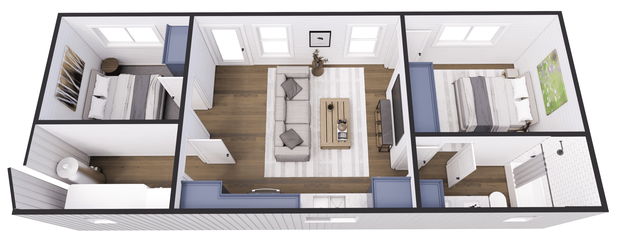 The Voyager transforms the shipping container house concept into a tiny house masterpiece, offering 640 square feet of off-grid brilliance across two 40-foot high cube containers. Inspired by our Trailblazer model, this 2 bedroom shipping container home blends sustainable living with modern comfort, delivering a custom container design that’s as functional as it is stylish. Whether you envision it as your dream home, an Airbnb rental, or a remote retreat, The Voyager proves that container home design can deliver high-quality living in a compact, eco-friendly package with unmatched durability.