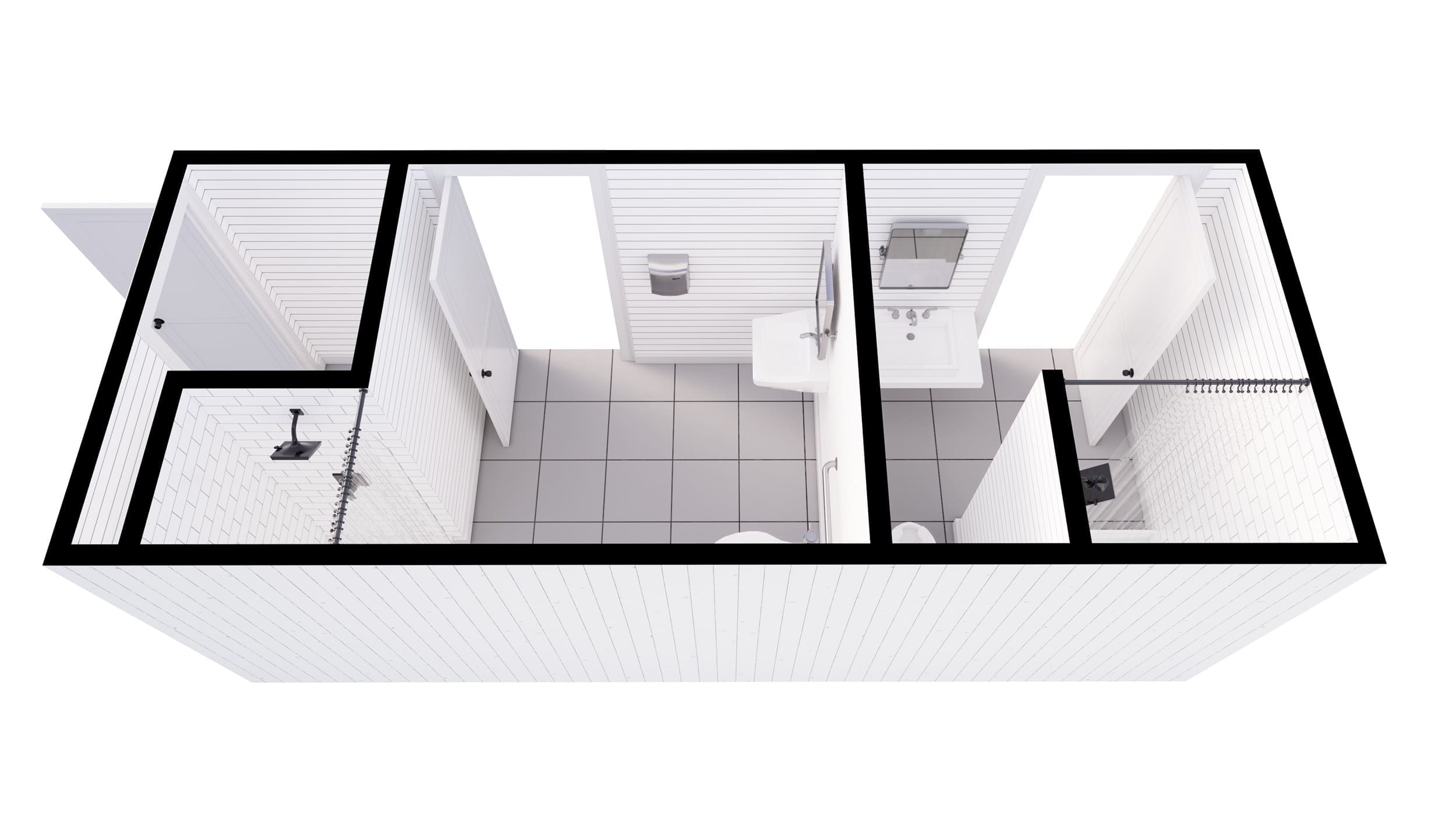 The floor plan of this shipping container bathroom is optimized for efficiency within its 160 sq ft footprint. The layout includes one ADA stall and one standard stall, each with a shower, ensuring accessibility and functionality. The design maximizes space while maintaining user comfort.