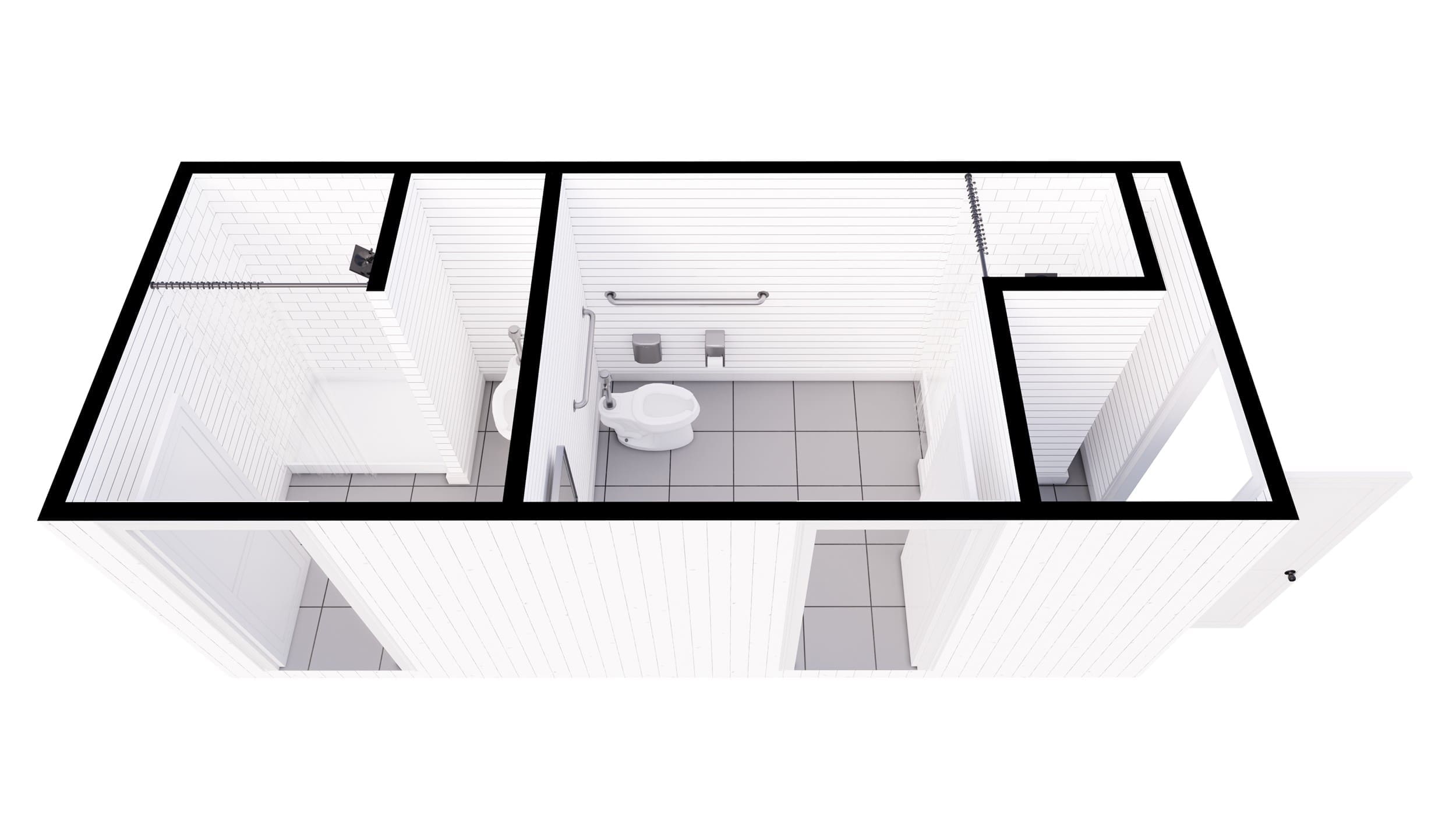 This shipping container bathroom is a modular, high-quality solution for compact restroom needs. It features one ADA stall and one standard stall, both with integrated showers, making it a cost-effective choice for various settings. Designed as a prefab unit, it ensures functionality and durability in a portable bathroom package.