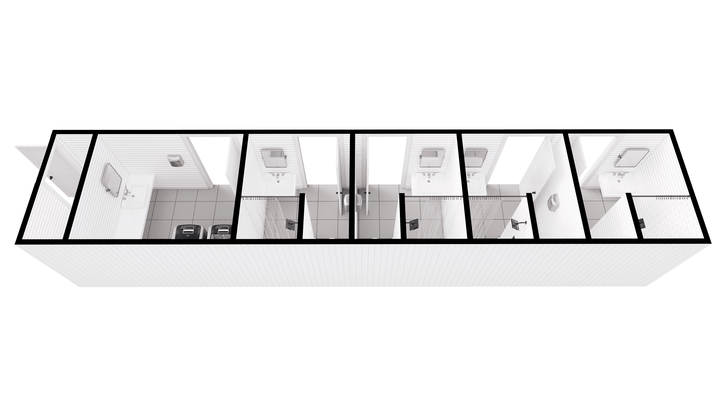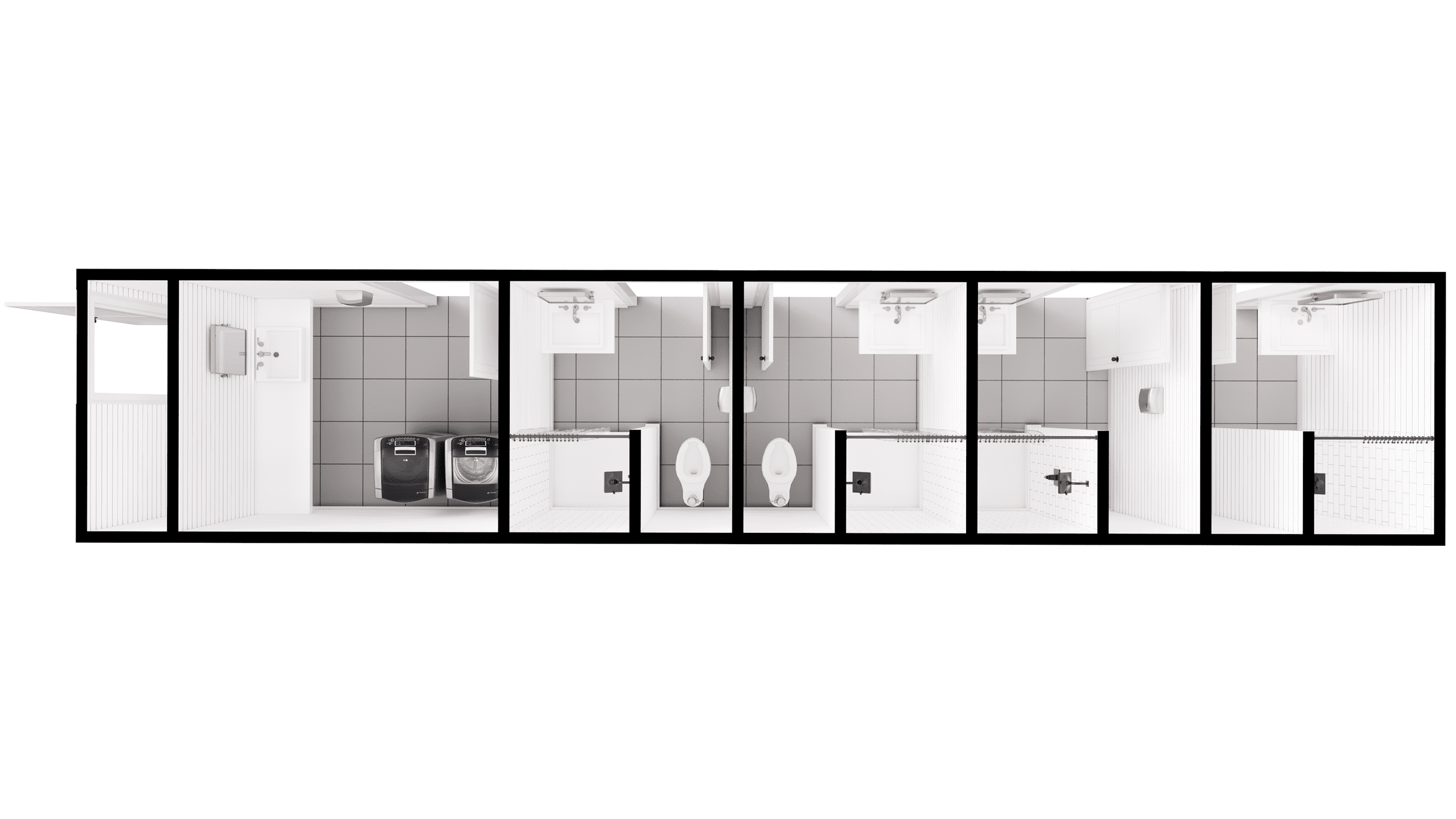 The 40 ft shipping container bathroom with laundry is a versatile, prefab sanitation solution designed for worksites, commercial spaces, and off-grid locations. This cargo container conversion offers the convenience of a fully functional restroom combined with a laundry area, making it ideal for extended projects and remote job sites. Built with a reinforced steel frame and meeting building code requirements, this unit provides long-term durability, ease of maintenance, and maximum efficiency.
