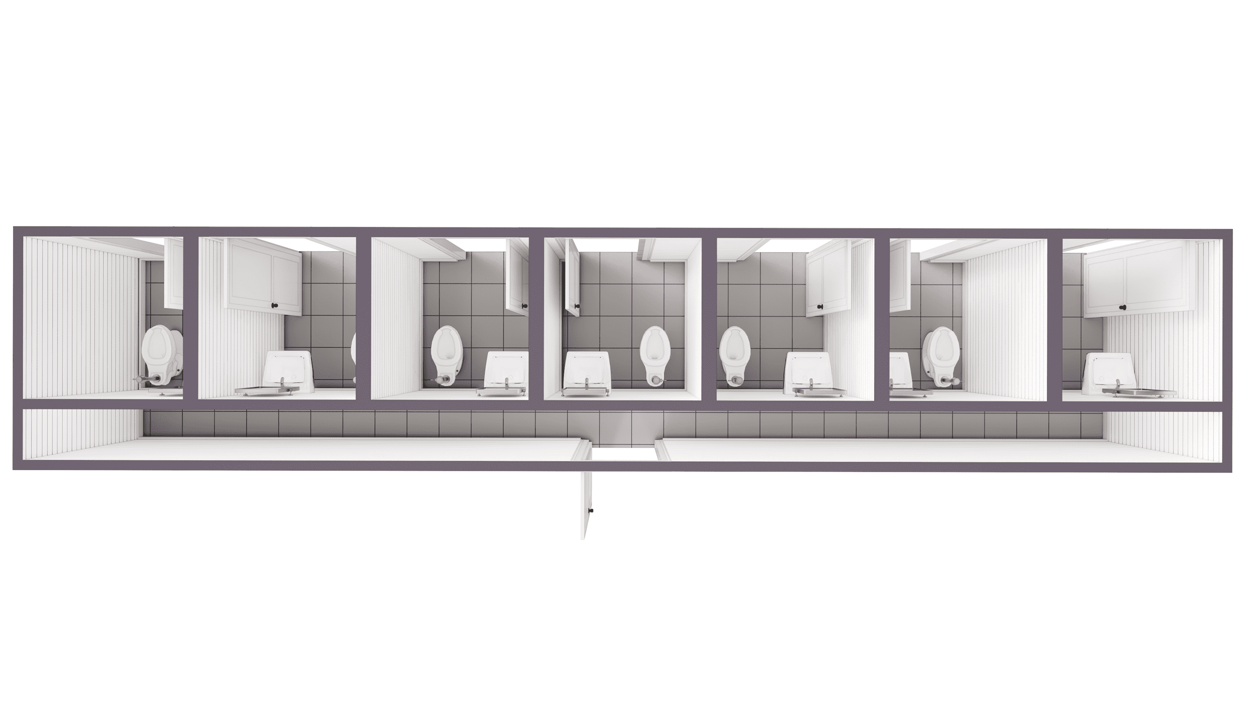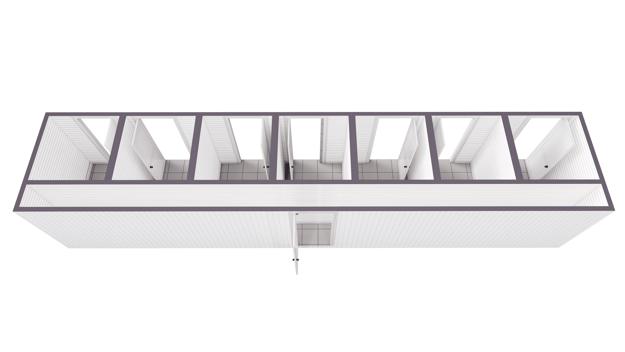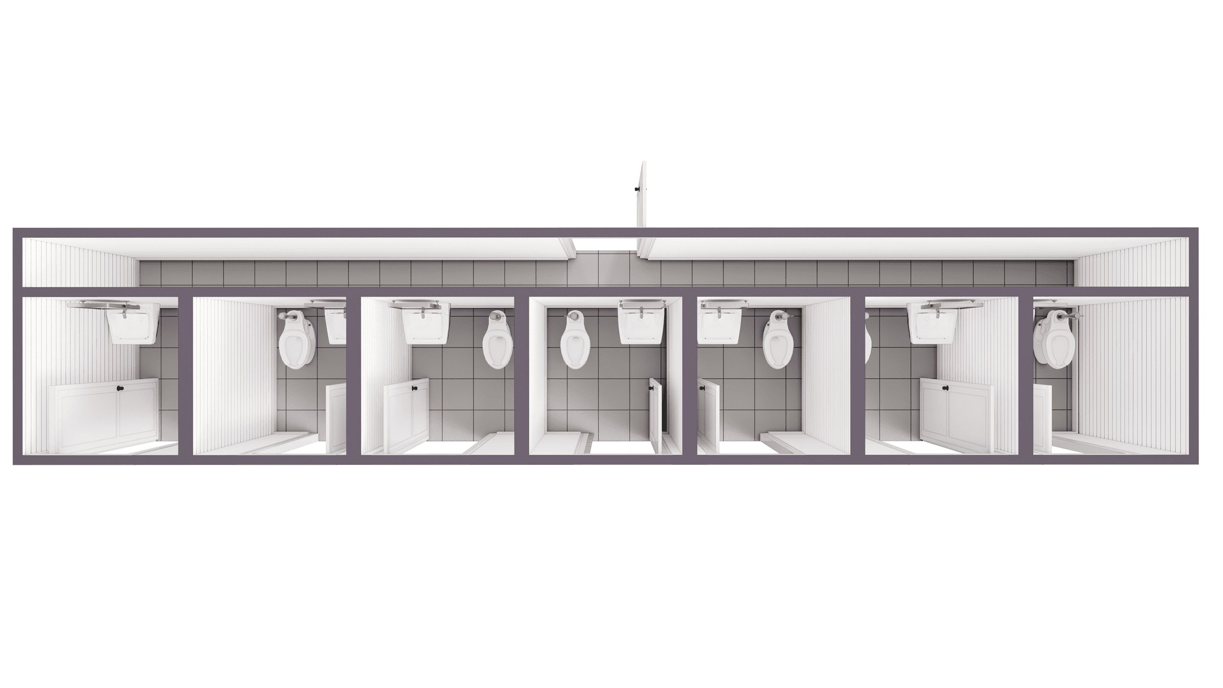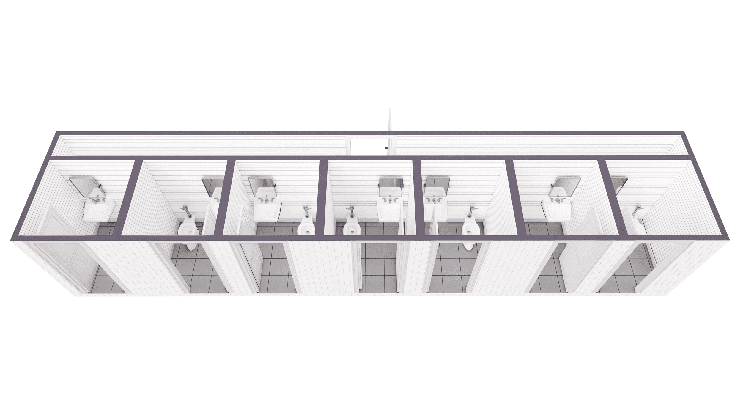 The floor plan of the 40 ft shipping container bathroom with storage is thoughtfully designed to maximize space and functionality. This layout includes seven individual stalls, each equipped with a toilet and basic fixtures, alongside a dedicated storage room for added convenience. The shipping container restroom ensures privacy and efficiency, making it a practical choice for various settings.