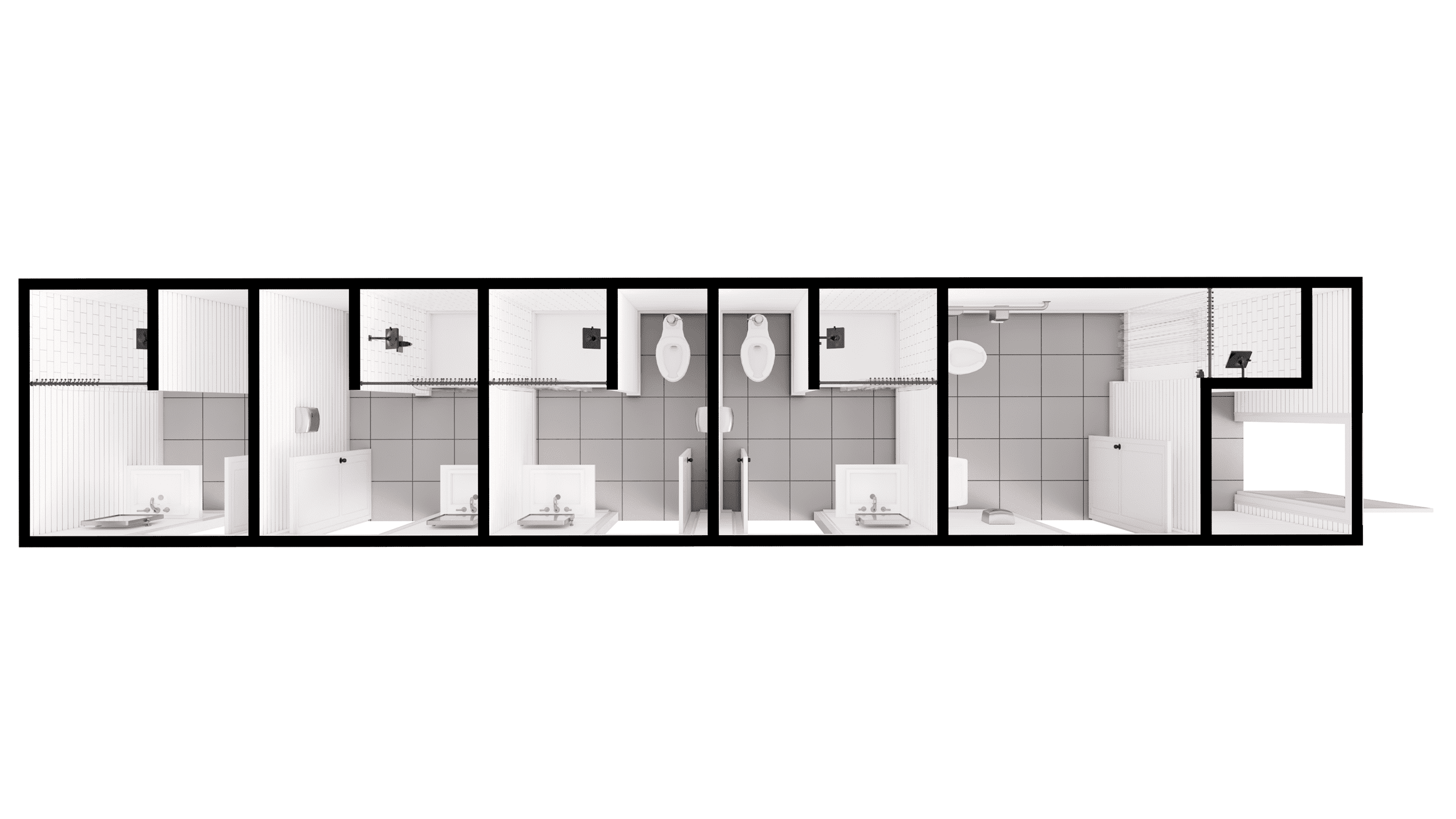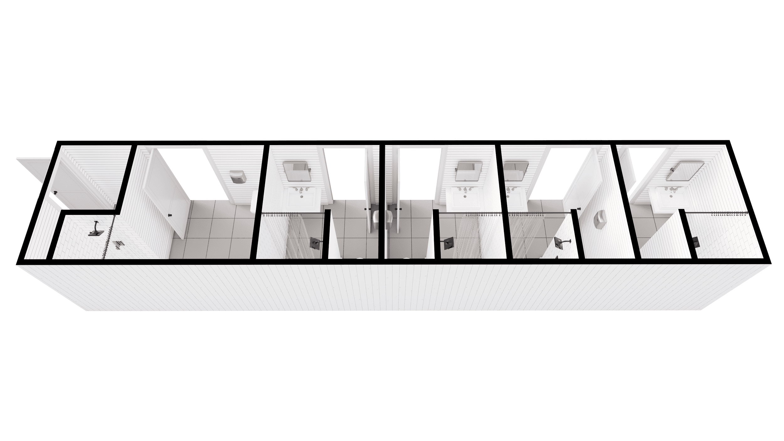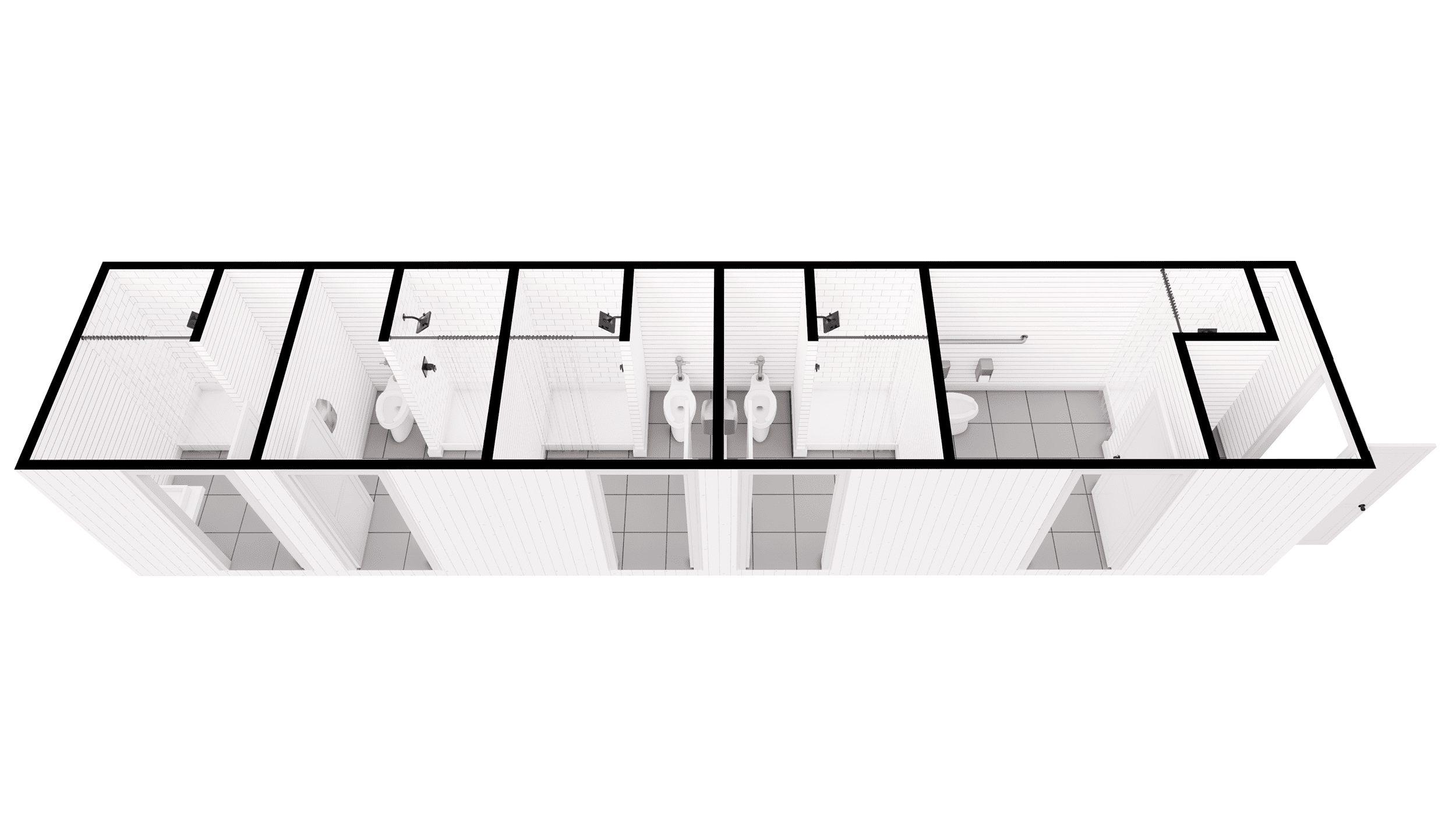 The floor plan of this shipping container bathroom is designed for accessibility and convenience. It features four standard toilet stalls and an ADA-compliant stall, each with an integrated shower, maximizing the 320 square feet of space. This bathroom design ensures privacy and functionality for all users.