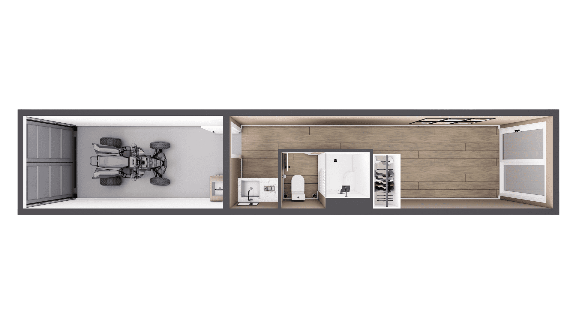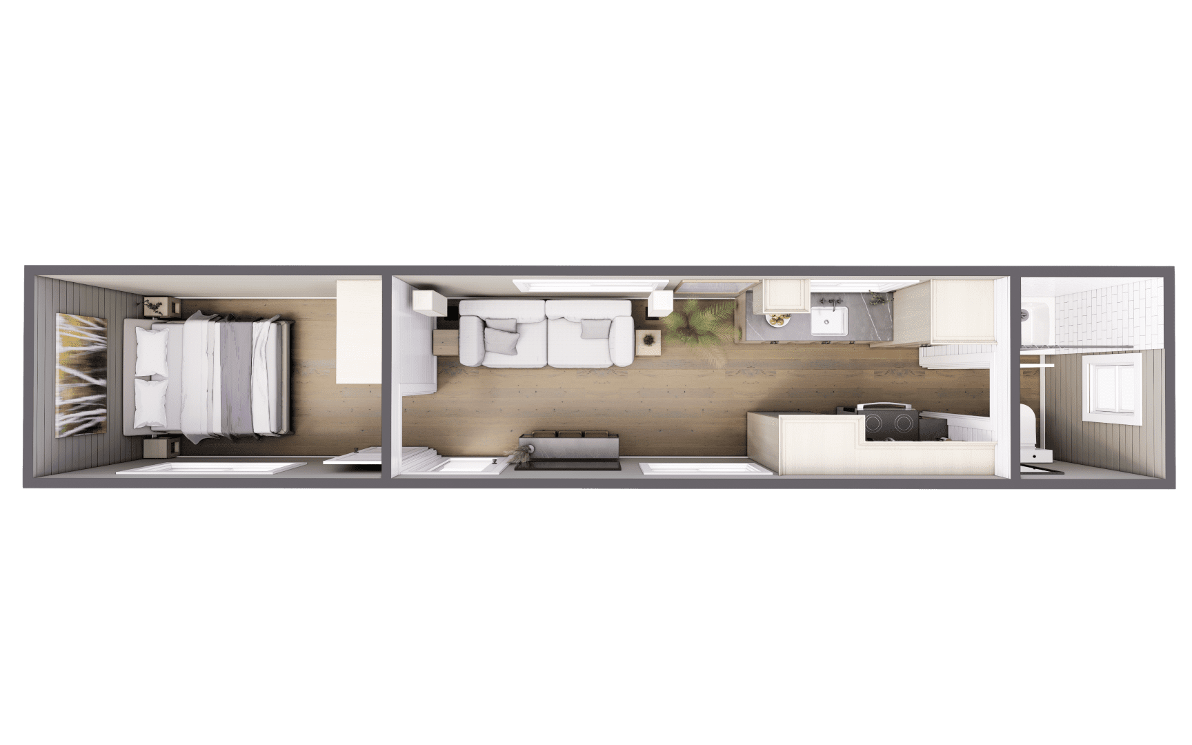 Our studio shipping container homes are the ideal tiny house solution for those seeking a compact yet comfortable living space. With smart floor plans and customization options, these environmentally conscious homes are perfect for an accessory dwelling unit (ADU), guest house, or Airbnb rental. Embrace the open-concept design and make this space uniquely yours.