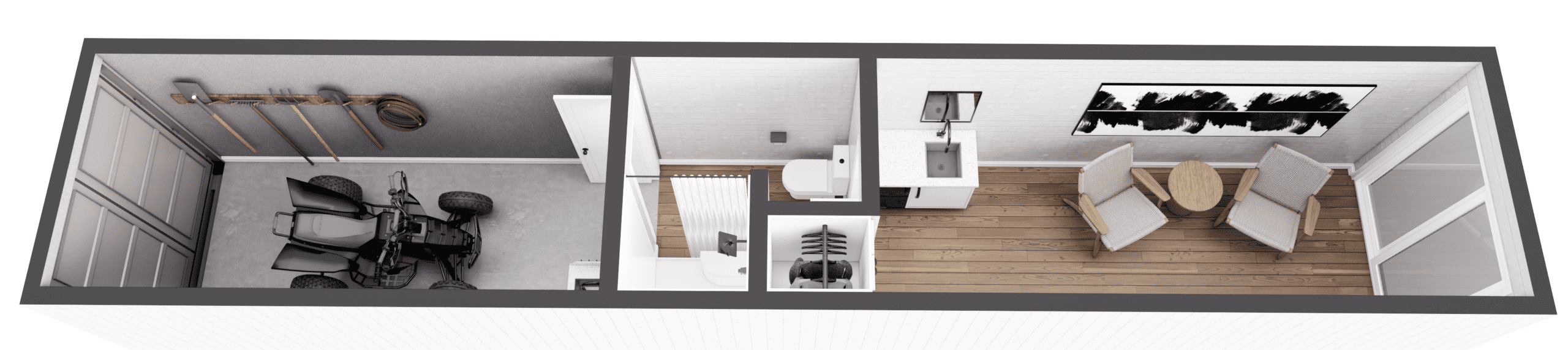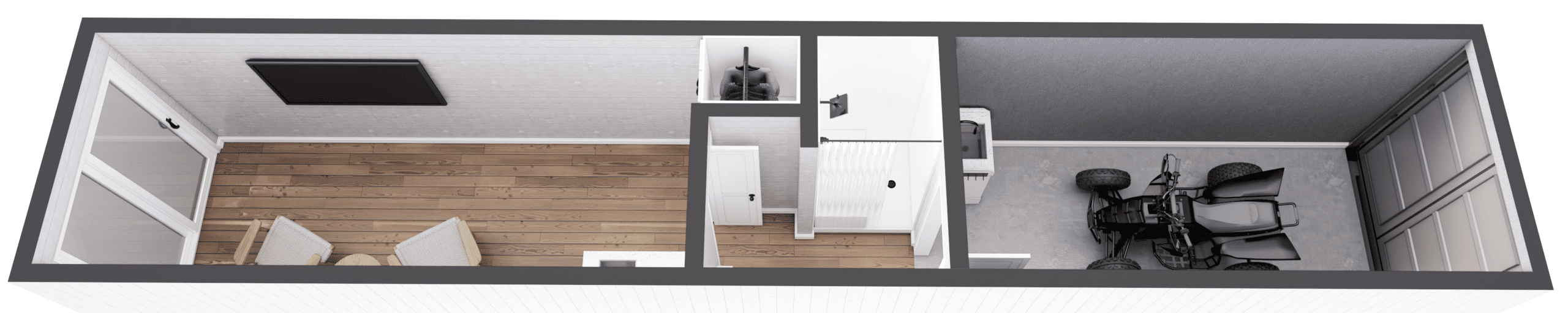 Enjoy urban or remote living with The Outdoor Cottage, a thoughtfully designed 40′ container home that redefines modern living, whether in the city or off the grid. The added garage space provides ample room for storing gardening tools, ATVs, or everyday items, keeping your living space clutter-free and organized. Combining functionality and comfort, this innovative space offers everything you need for a fulfilling lifestyle, no matter where you choose to call home.