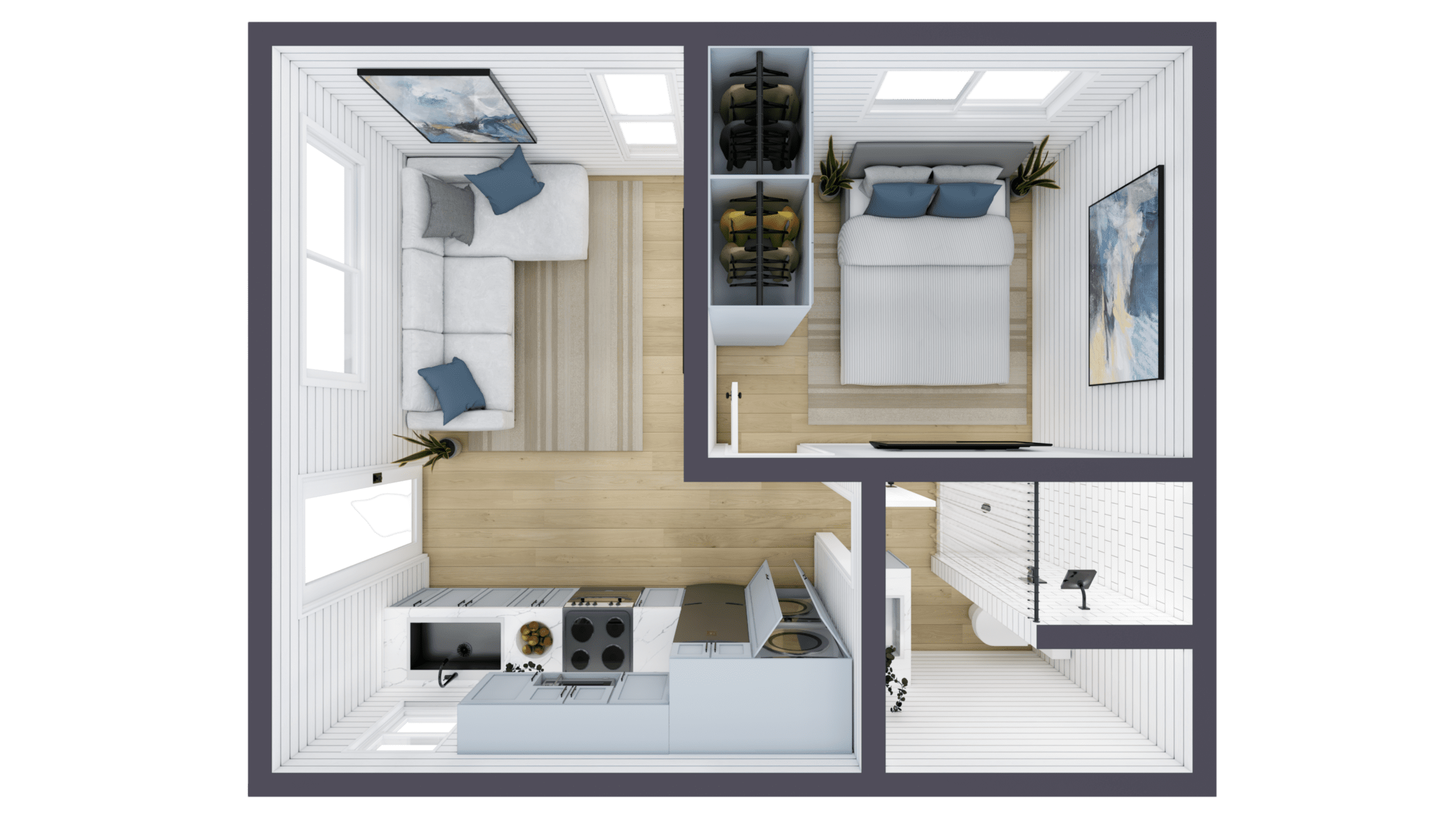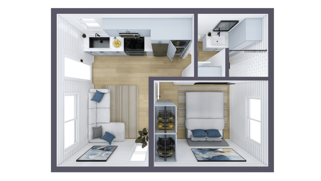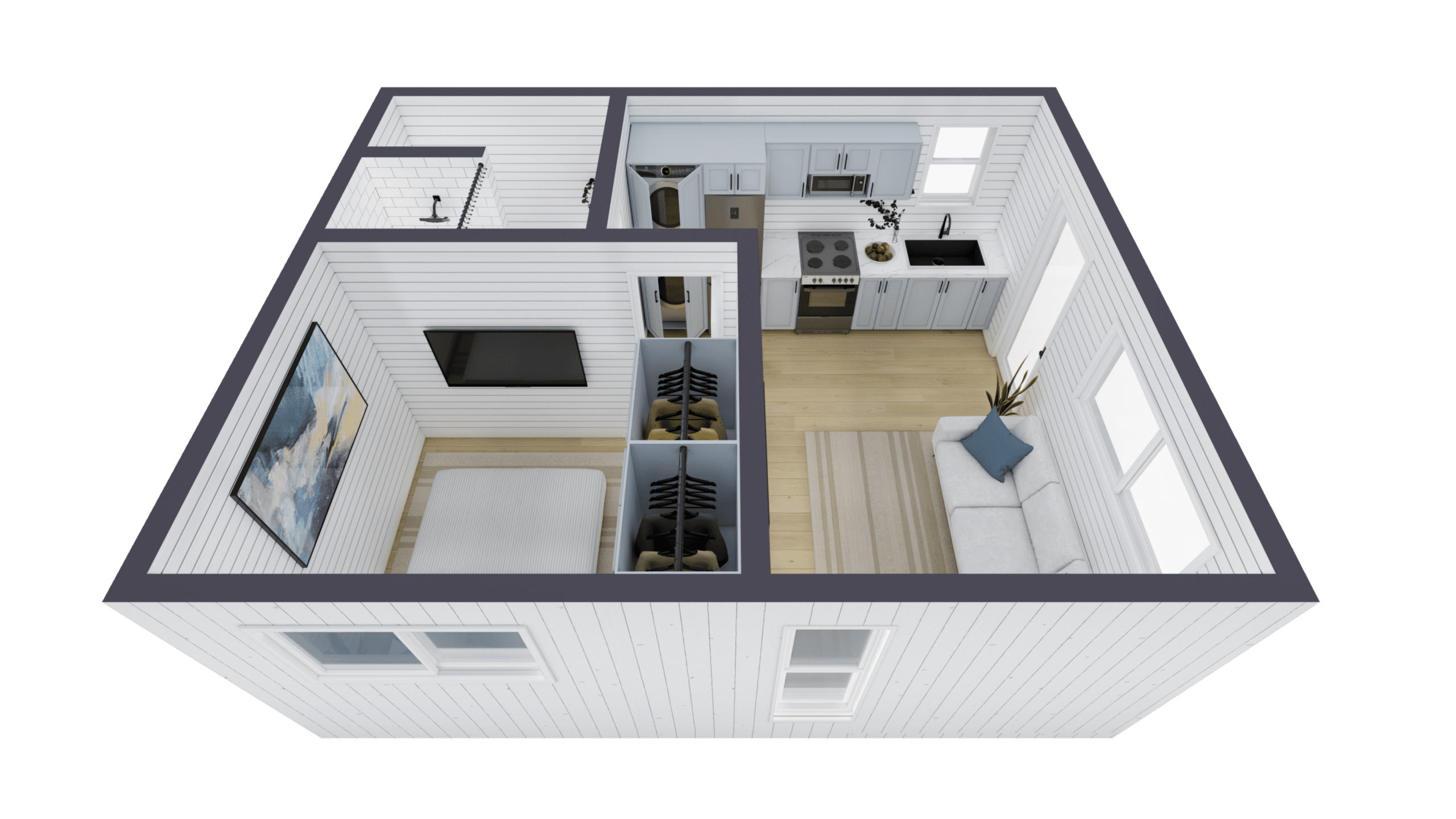 The Happy Twogether floor plan is the perfect blend of style, efficiency, and sustainable living in a minimalist shipping container house design. Ideal for singles and couples, this small house maximizes space and functionality with an open-living area, nice storage solutions, and an abundance of natural light. Explore the endless possibilities of this one bedroom shipping container home within two 20-foot containers.